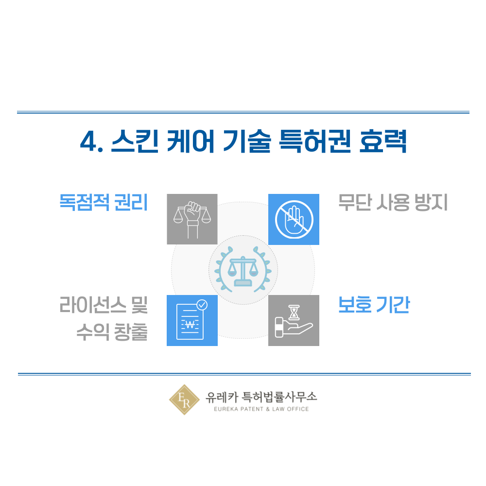 클렌징, 토너, 미스트 조성물이나 기능성 용기·패키징 기술이 특허로 등록되면 해당 기술은 출원인에게만 사용할 수 있는 독점적 권리가 부여됩니다.