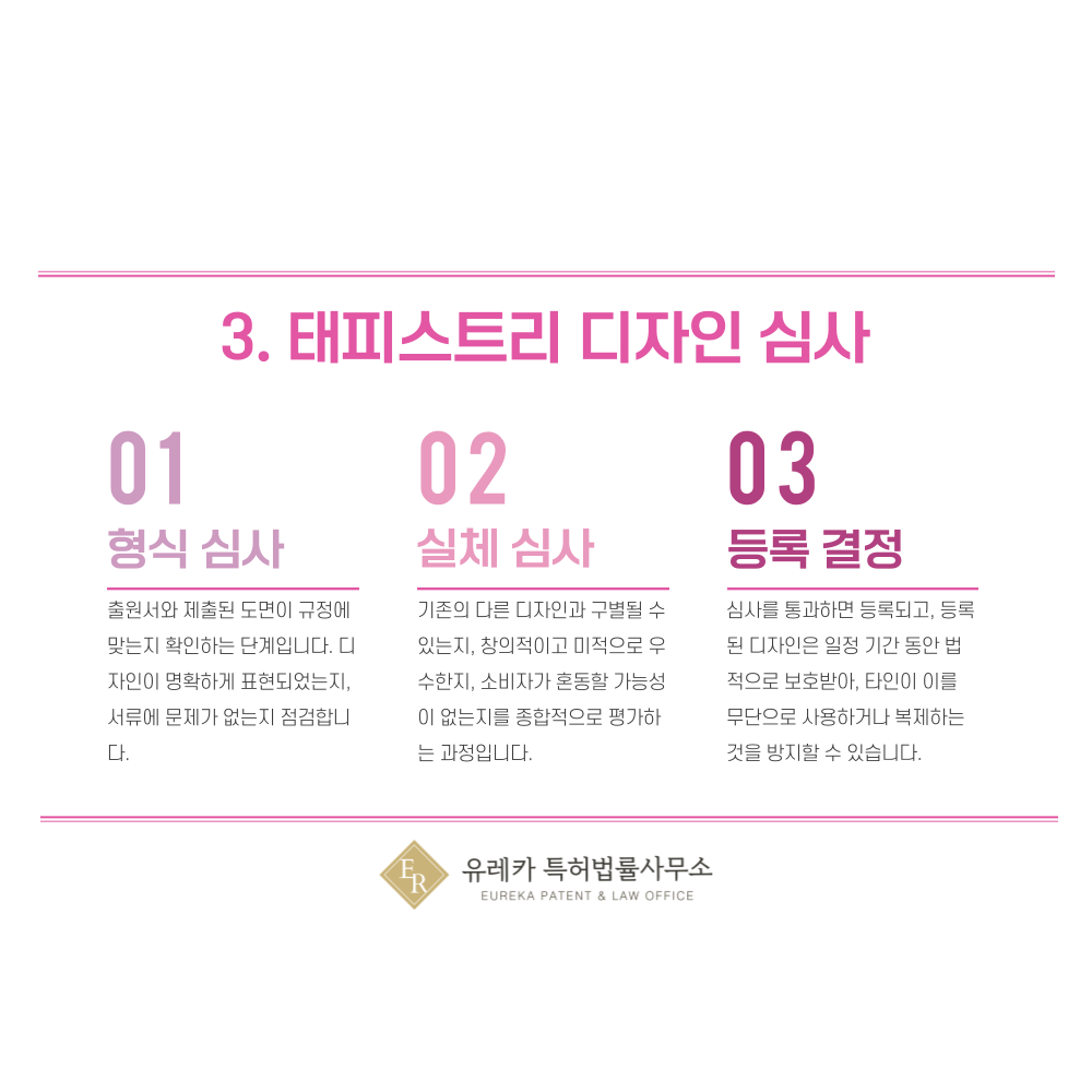이 과정이 충실할수록 심사 단계에서 디자인의 특징을 명확히 인정받을 수 있습니다.