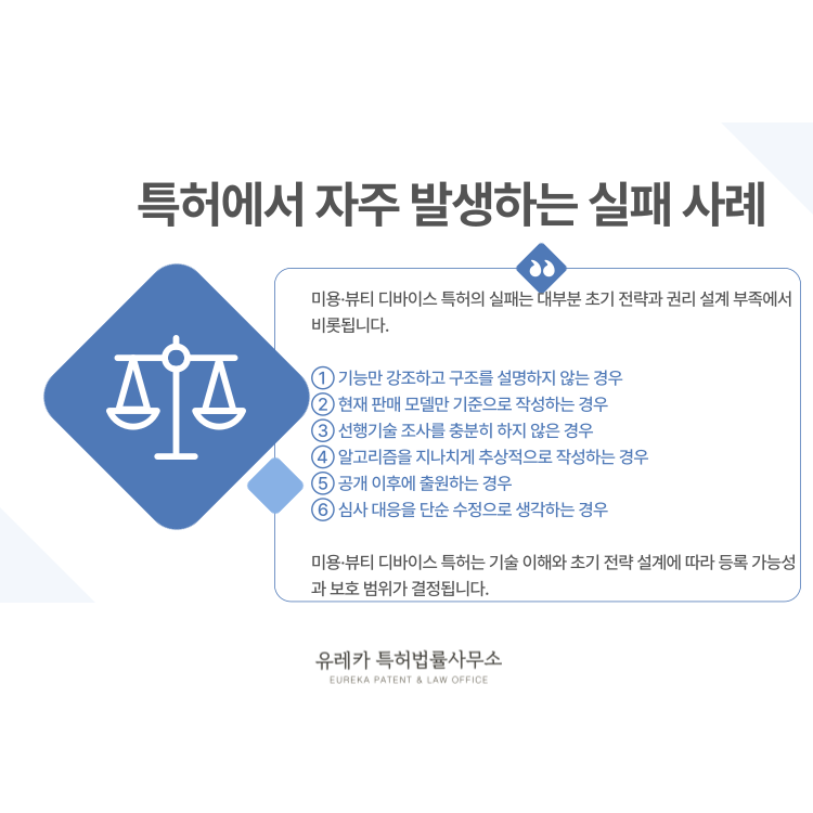 미용·뷰티 디바이스 특허에서 자주 발생하는 실패 사례는 대부분 초기 전략 부족에서 시작됩니다.