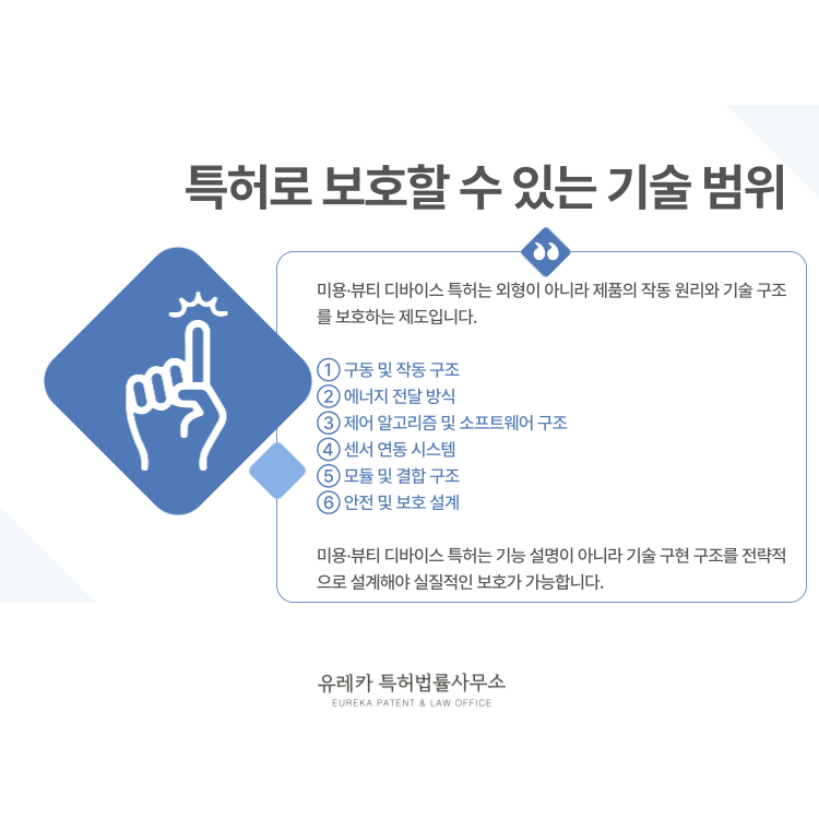미용·뷰티 디바이스 특허로 보호할 수 있는 기술 범위는 생각보다 넓습니다.