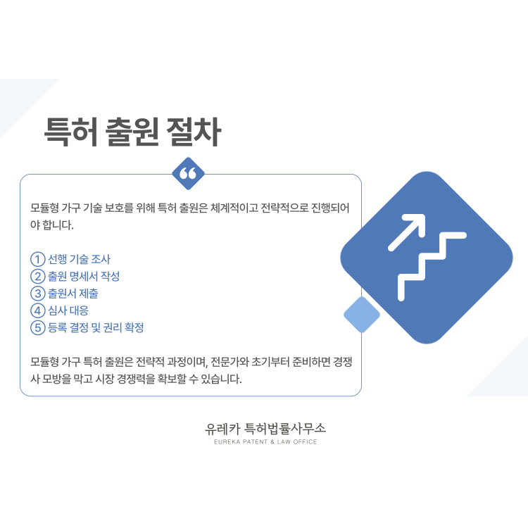 모듈형 가구 특허 출원은 단순한 서류 제출이 아니라, 기술 분석, 권리 설계, 심사 대응까지 포함하는 전략적 과정입니다.