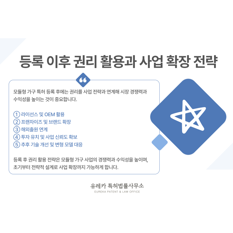 등록 이후 권리 활용 전략은 단순 법적 보호를 넘어, 모듈형 가구 사업 전체의 경쟁력과 수익성을 높이는 핵심 요소입니다.