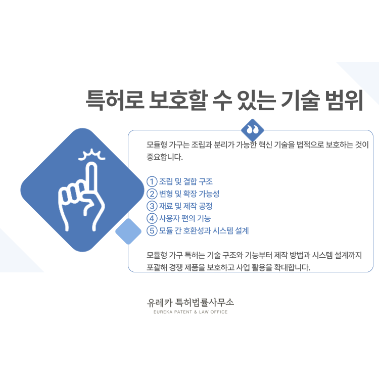 유레카특허법률사무소는 모듈형 가구 기술 출원과 권리 설계에 전문성을 갖추고 있으며,