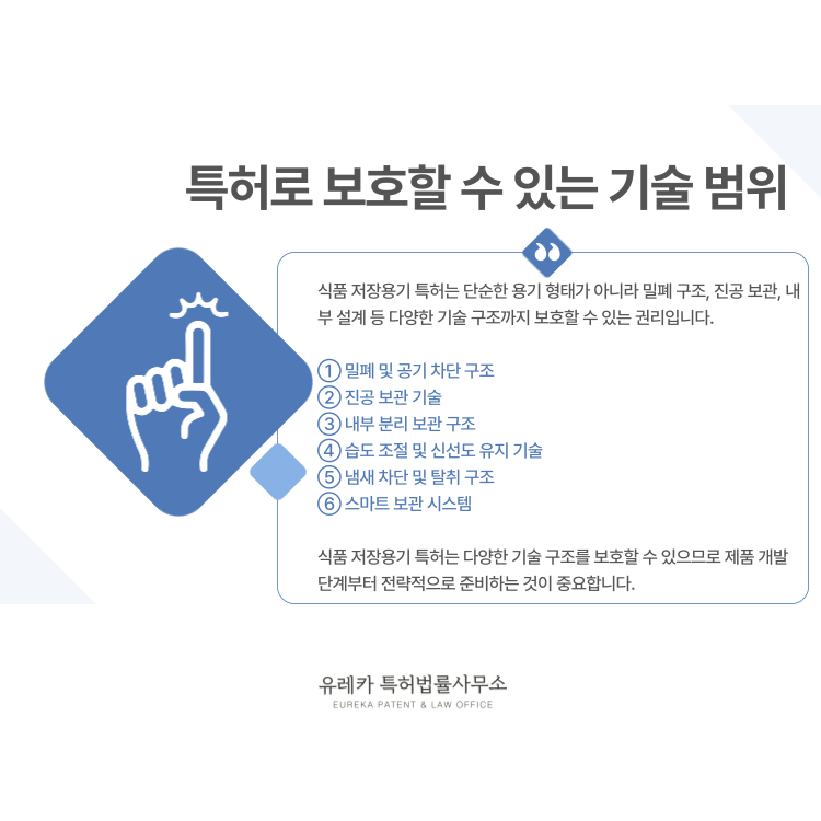 용기 내부 공기를 제거하거나 진공 상태를 유지하는 구조도 식품 저장용기 특허로 보호할 수 있습니다.