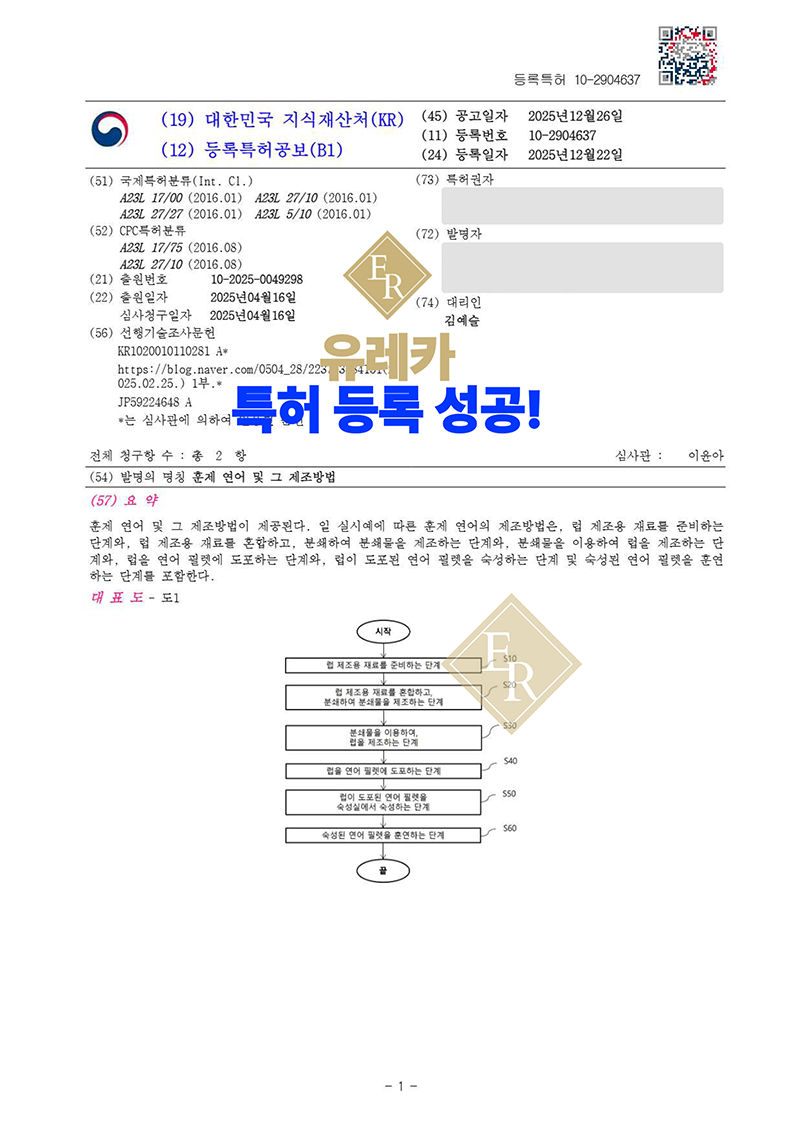 #훈제연어특허 #훈제연어제조방법 #수산가공식품특허 #식품제조특허 #가공식품특허 #제조공정특허 #식품기술보호 #PatentRegistration #PatentApplication #특허 #특허출원 #특허등록 #특허권 #특허등록사례 #유레카특허법률사무소