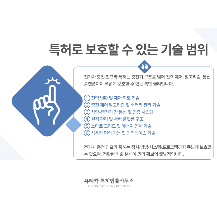 전력 변환 기술, 충전 제어 알고리즘, 통신 및 인증 시스템, 서버 기반 관리 플랫폼까지 폭넓게 보호할 수 있는 권리입니다.