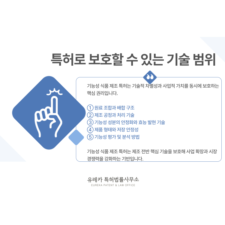결국 기능성 식품 제조 특허는 원료·공정·효능·제품형태·평가 기술 등 제조 전반의 핵심 요소를 포괄적으로 보호할 수 있습니다.
