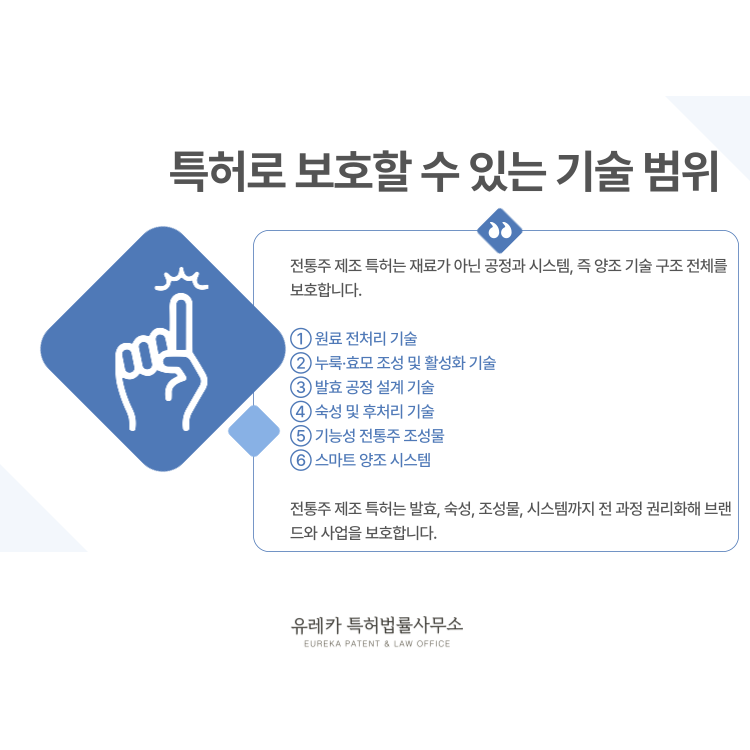 정리하면 전통주 제조 특허는 재료, 발효, 숙성, 조성물, 시스템까지 전 과정을 보호하는 권리입니다.