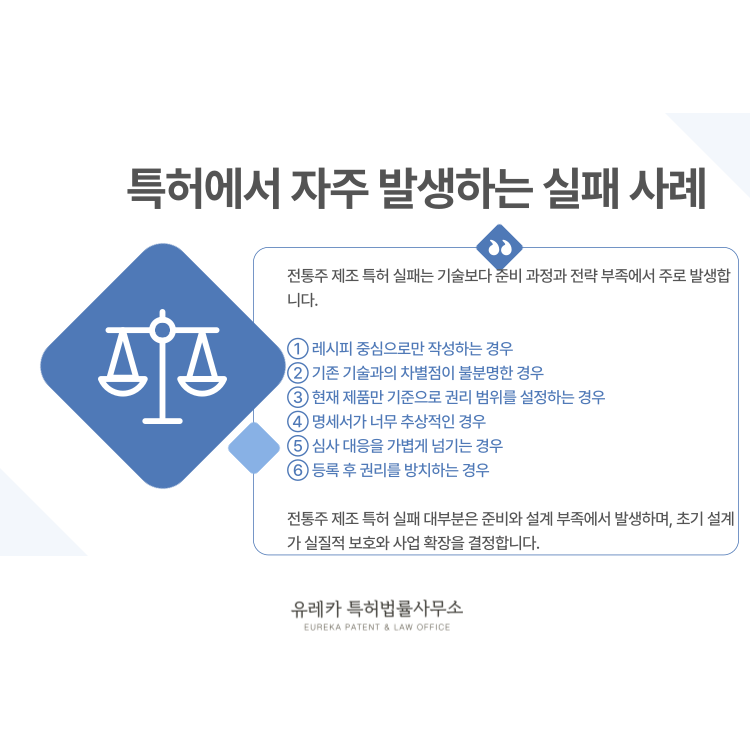 전통주 제조 특허에서는 기술 자체보다 준비 방식 때문에 실패하는 경우가 더 많습니다.