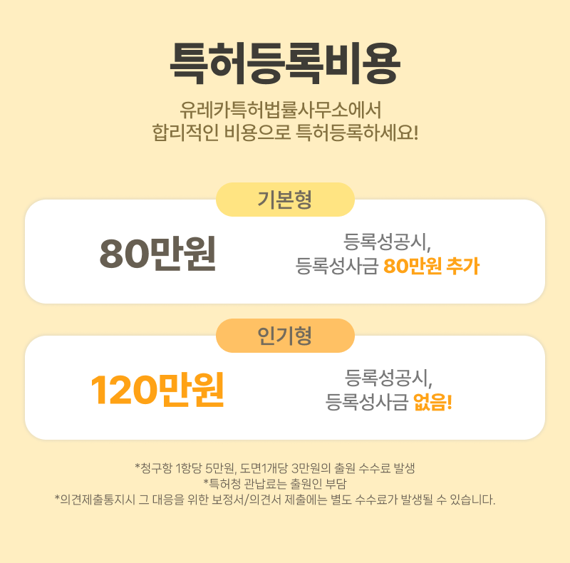 유레카 특허법률사무소는 출원 착수금 80만원의 합리적인 금액으로 진행됩니다.