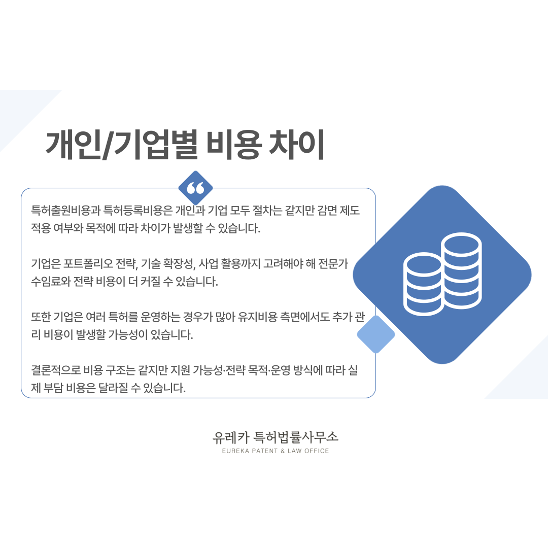 특허출원비용과 특허등록비용은 개인과 기업 모두 동일한 절차를 거치지만, 비용 구조나 지원 가능 범위는 조금씩 달라질 수 있습니다.