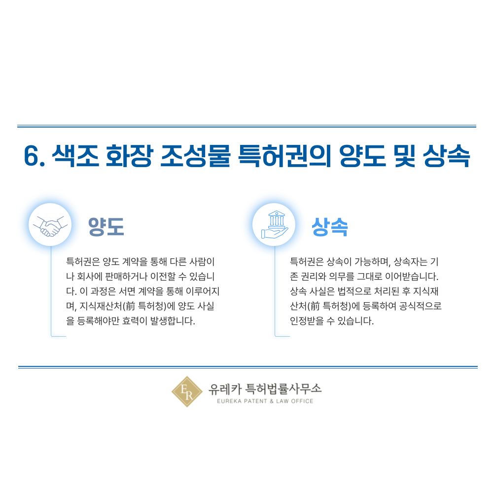 6. 색조 화장 조성물, 파운데이션, 쿠션, 컨실러, 립스틱, 틴트, 마스카라 조성물, 용기, 패키징 특허권의 양도 및 상속