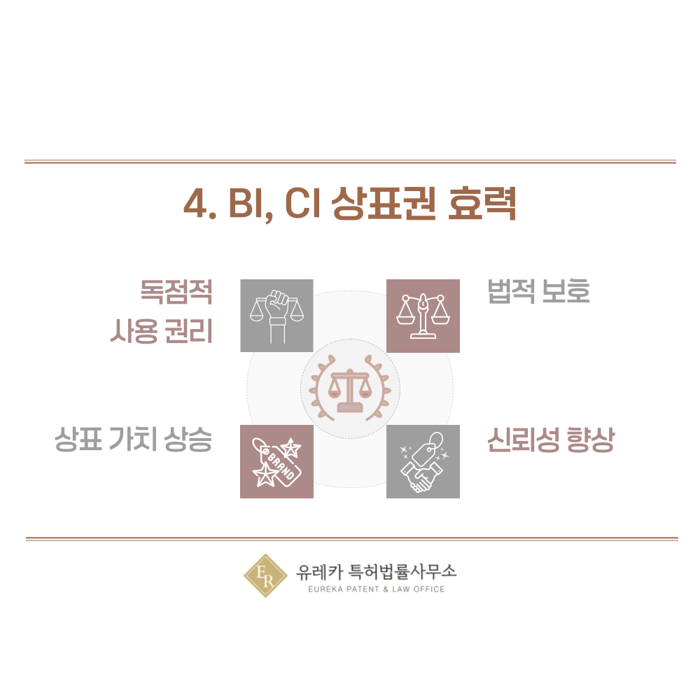 BI, CI가 상표로 등록되면 해당 이름과 로고를 사용할 수 있는 독점적 권리가 생깁니다.