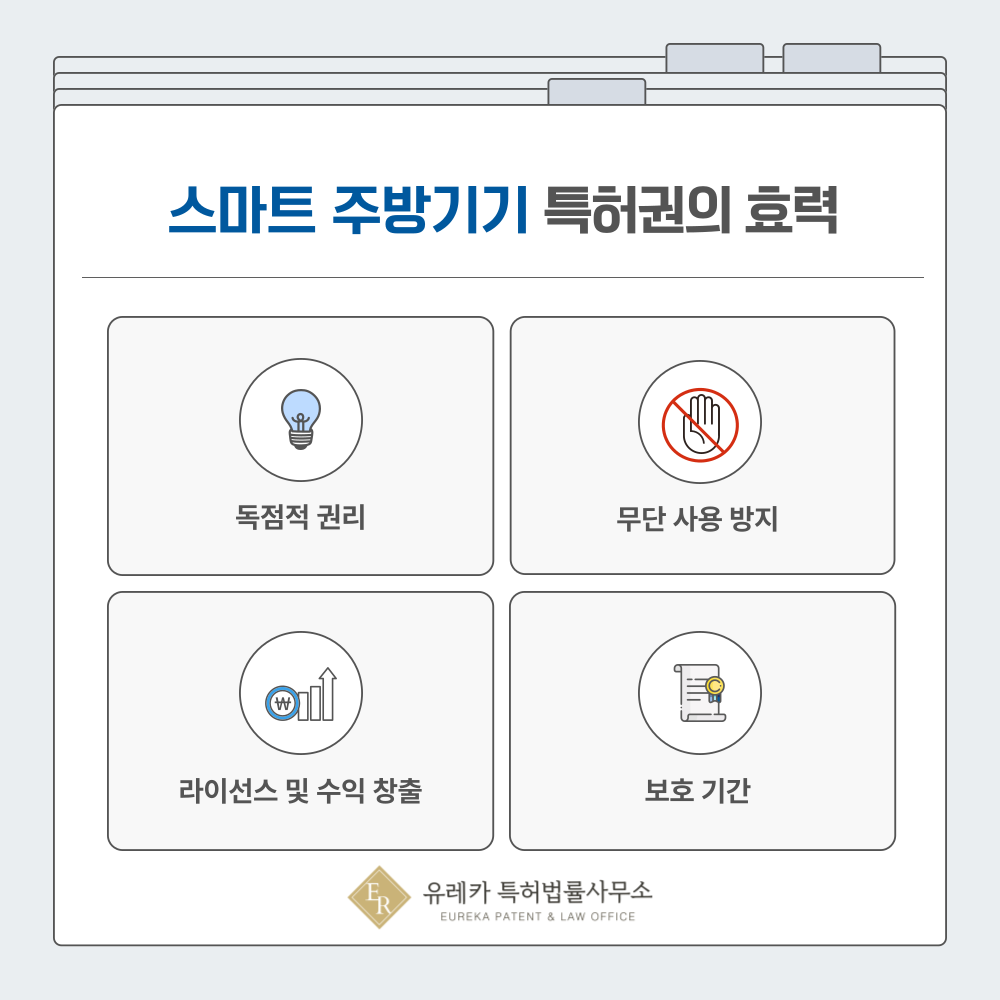 IoT 기반 스마트 주방용품이나 주방 가전 특허가 등록되면 해당 기술은 일정 기간 동안 독점적으로 사용할 수 있는 권리가 부여됩니다.