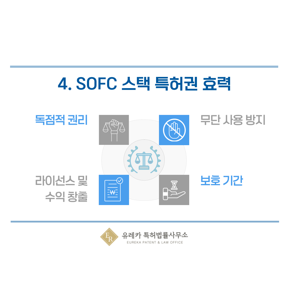 SOFC 스택, YSZ, Ni-YSZ와 같은 연료전지 핵심 기술이 특허로 등록되면 권리자는 해당 기술을 독점적으로 사용할 수 있는 권리를 가집니다. 이는 다른 사람이 동일하거나 유사한 방식으로 기술을 활용하려면 반드시 권리자의 허락을 받아야 한다는 의미입니다. 덕분에 권리자는 연구 성과를 안정적으로 보호하고 시장에서 주도적인 지위를 확보할 수 있습니다.