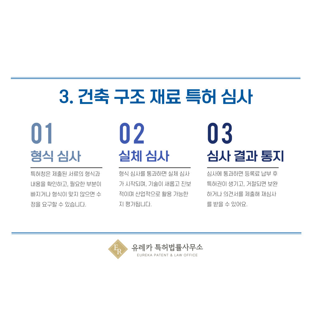 건축 구조재, 고로슬래그, 철골, 철근, 목구조 관련 기술을 출원하면 가장 먼저 형식심사가 이루어집니다.