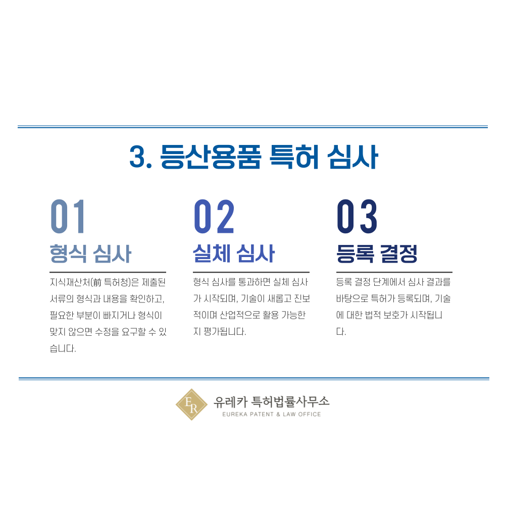 등산화·배낭·로프·카라비너·헤드램프 등과 같은 등산용품 기술을 출원하면 가장 먼저 형식심사가 이루어집니다.