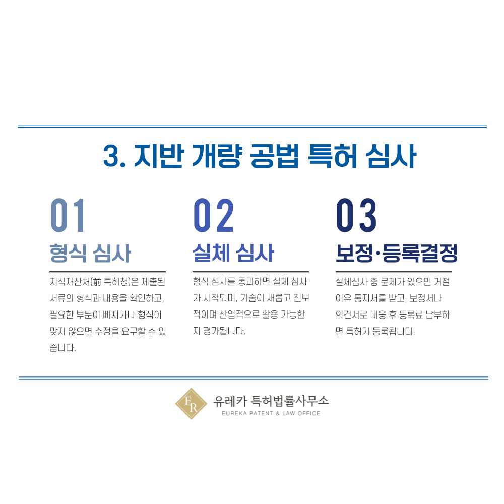 바이브로 플로테이션, 제트그라우팅, 경사계와 같은 지반공학 기술을 출원하면 가장 먼저 형식심사가 진행됩니다.