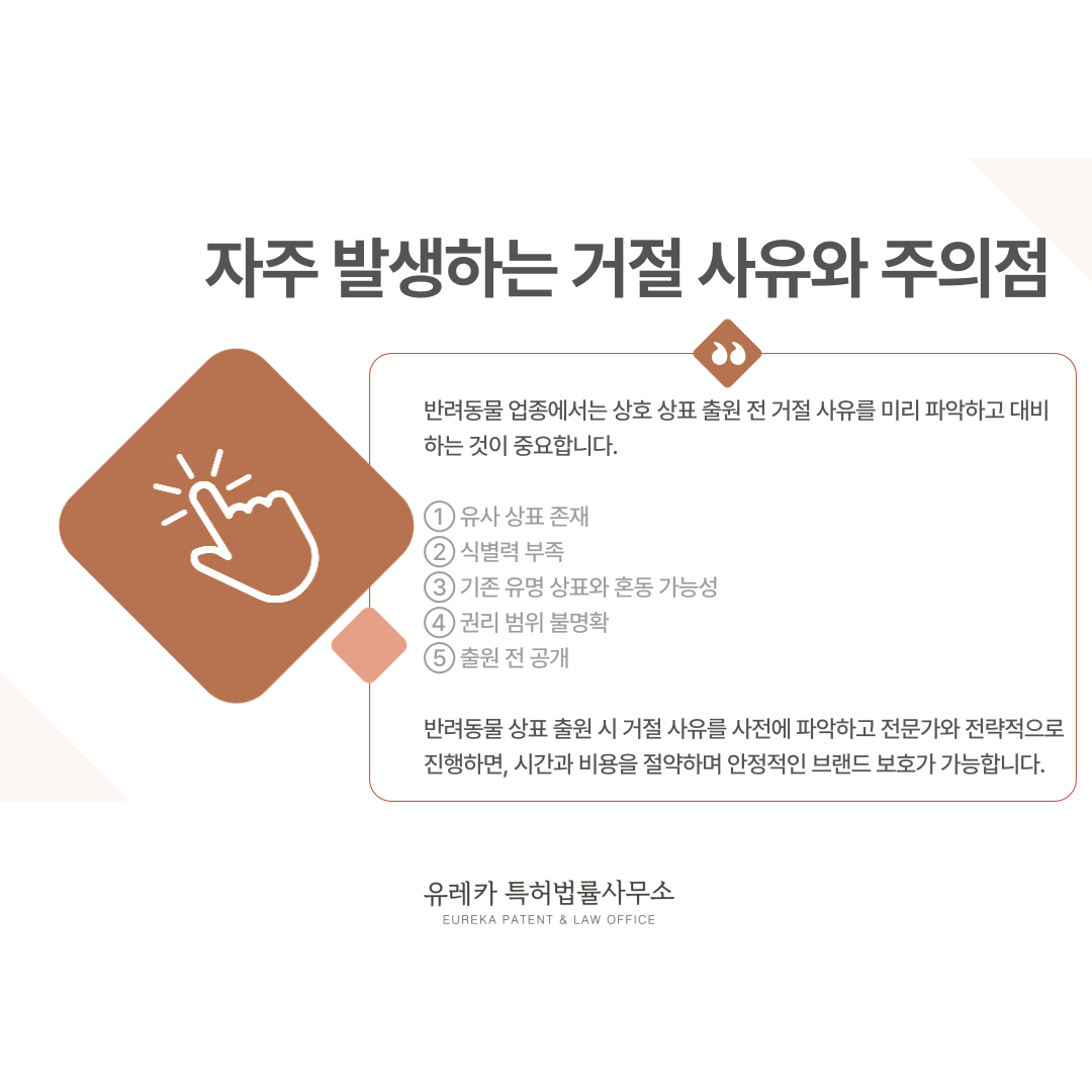 반려동물 업종에서 상호 상표를 출원할 때, 거절 사유를 미리 이해하고 대비하는 것이 중요합니다.