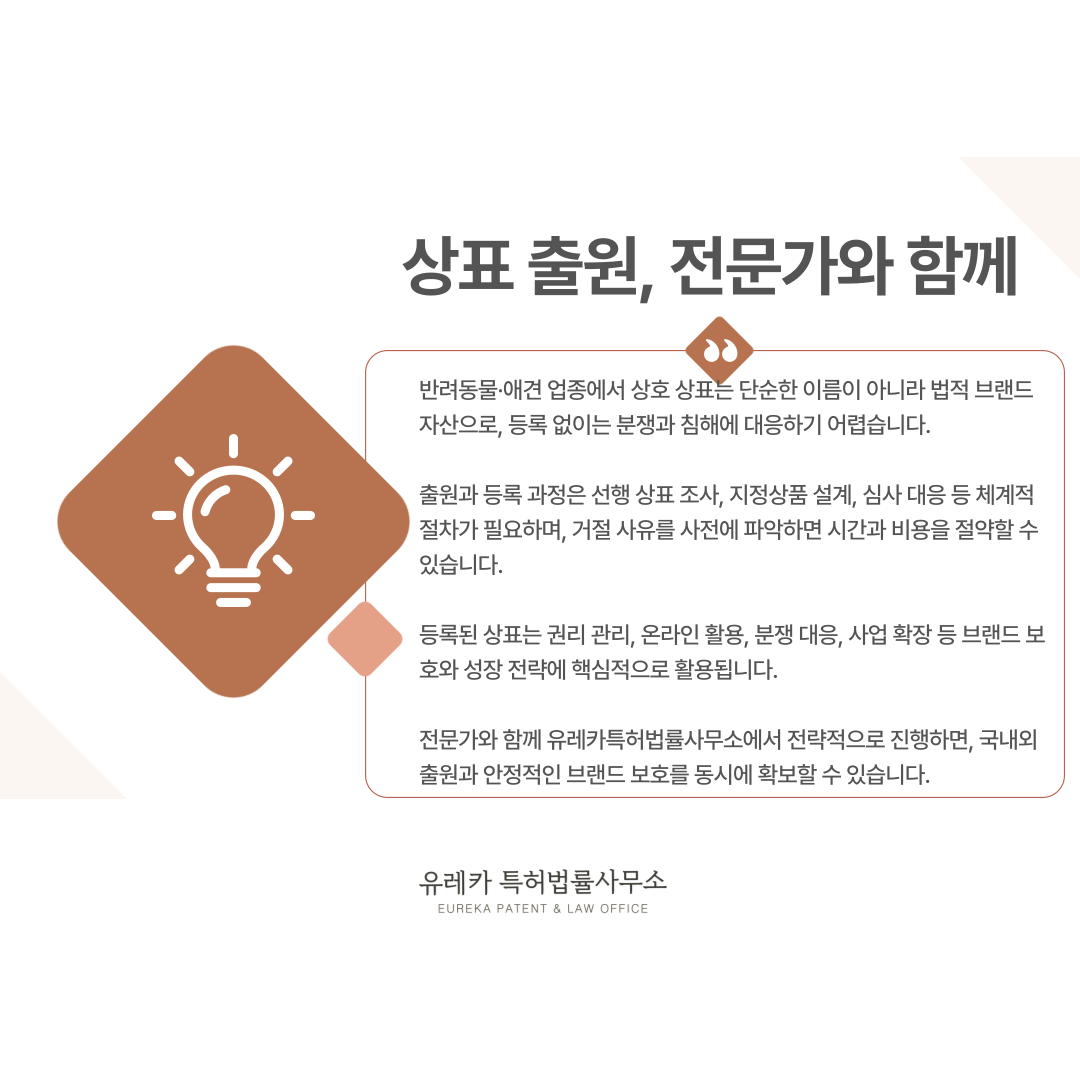 #반려동물상표 #애견상표 #반려동물브랜드 #애견용품상표 #반려동물미용상표 #반려동물훈련상표 #브랜드보호 #TrademarkRegistration #TrademarkApplication #상표 #상표권 #상표출원 #상표등록 #유레카특허법률사무소