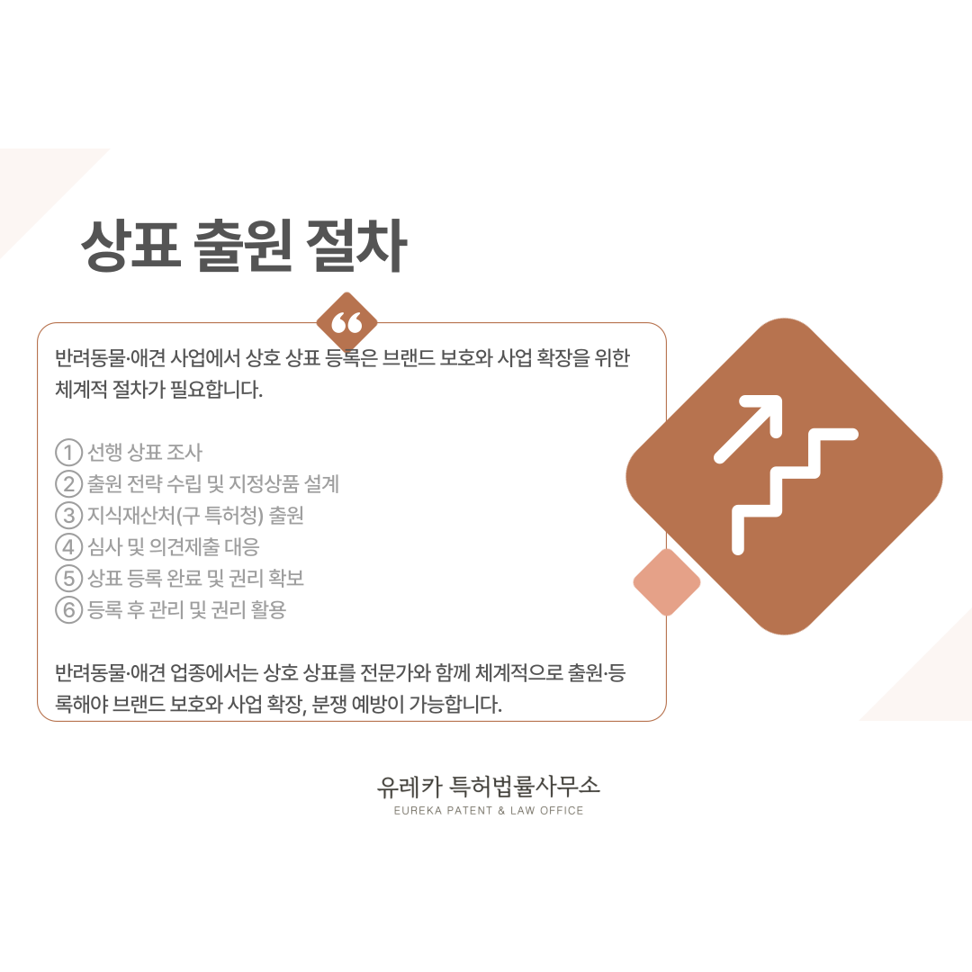 결론적으로, 반려동물·애견 업종에서 상호 상표 출원과 등록 절차를 처음부터 체계적으로 준비하면,