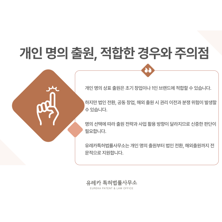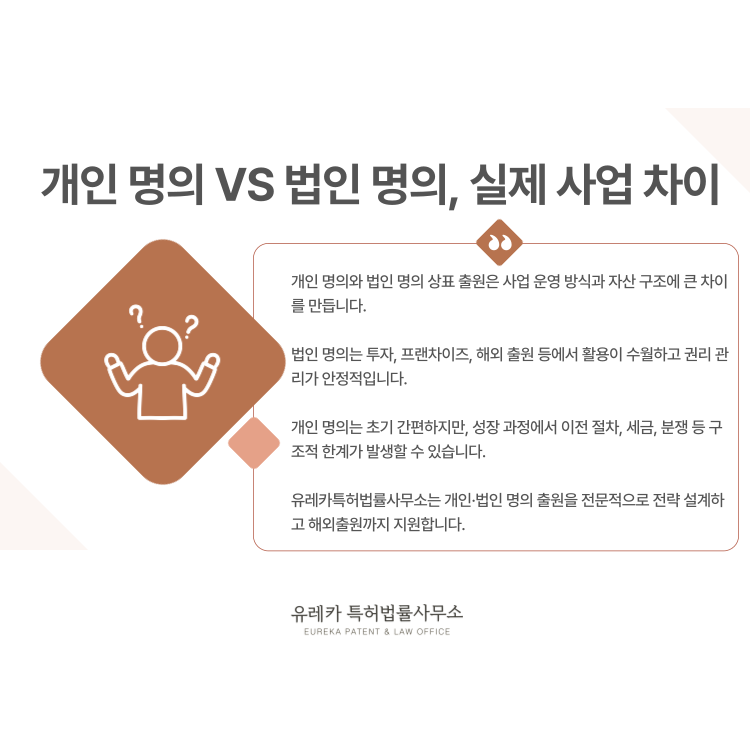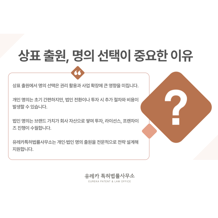 #개인명의상표 #법인명의상표 #상표전략 #상표명의선택 #지식재산권 #브랜드보호 #해외상표출원 #TrademarkRegistration #TrademarkApplication #상표 #상표권 #상표출원 #상표등록 #유레카특허법률사무소