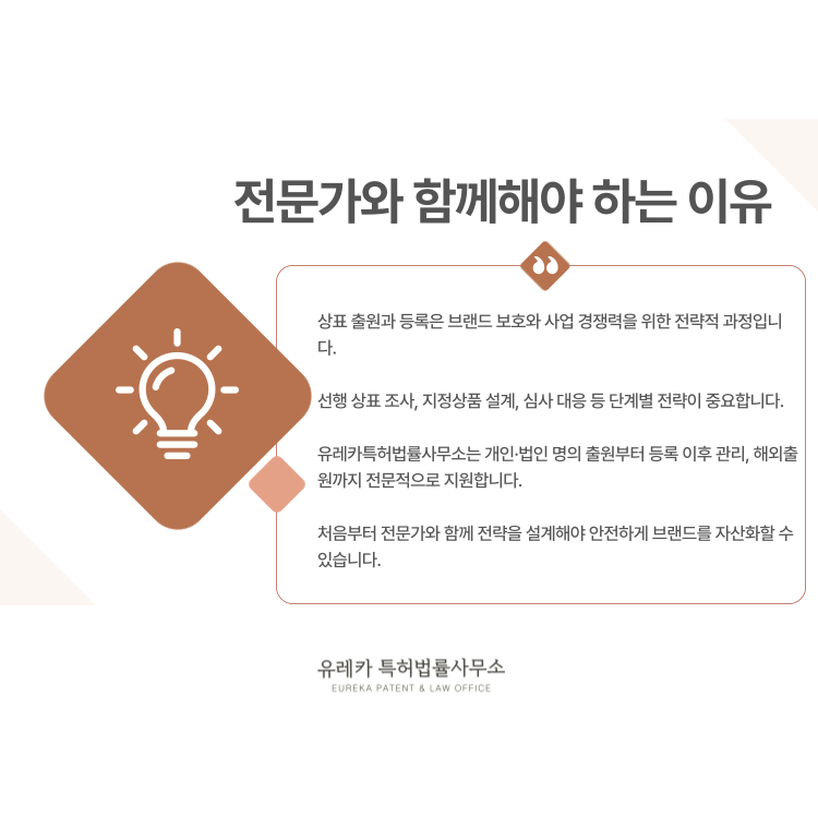 그래서 상표 출원은 처음부터 전문가와 함께 전략적으로 준비하는 것이 중요합니다.