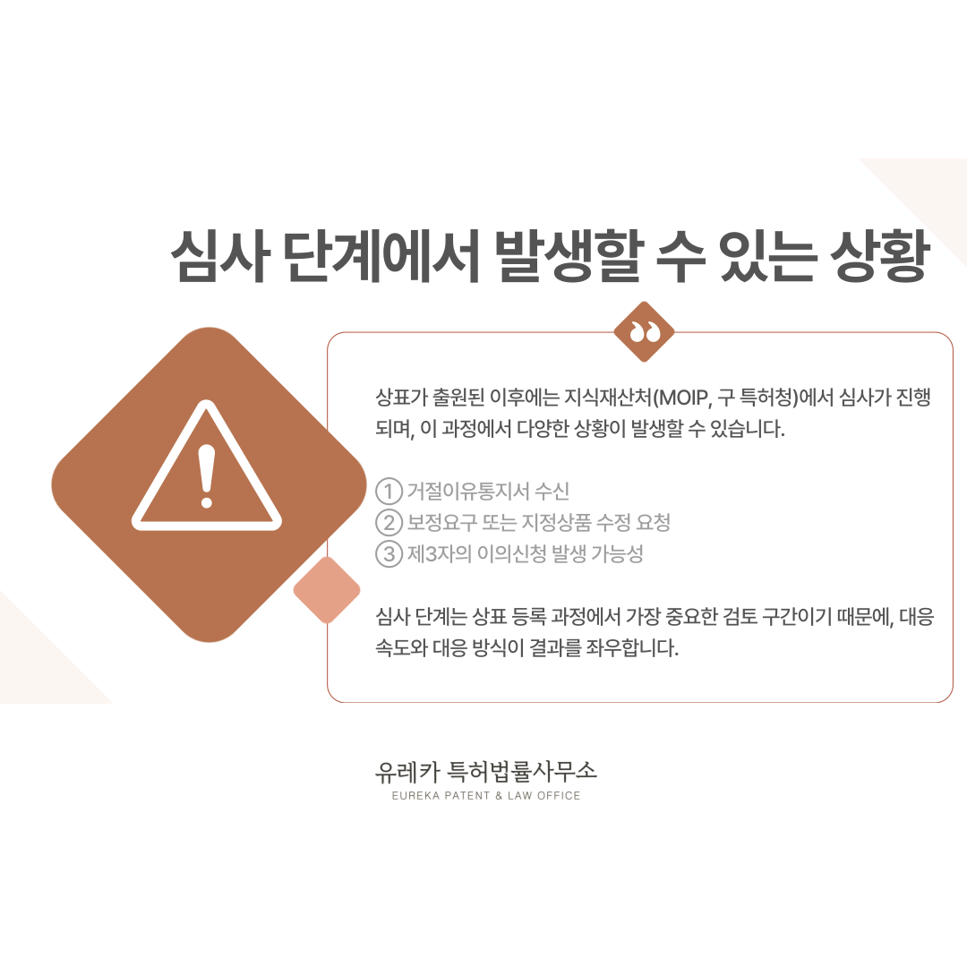 심사 단계는 단순한 확인 절차가 아니라 법적 기준을 기반으로 상표 등록 가능성을 판단하는 과정이기 때문에, 상황에 따라 적절한 대응이 필요합니다.