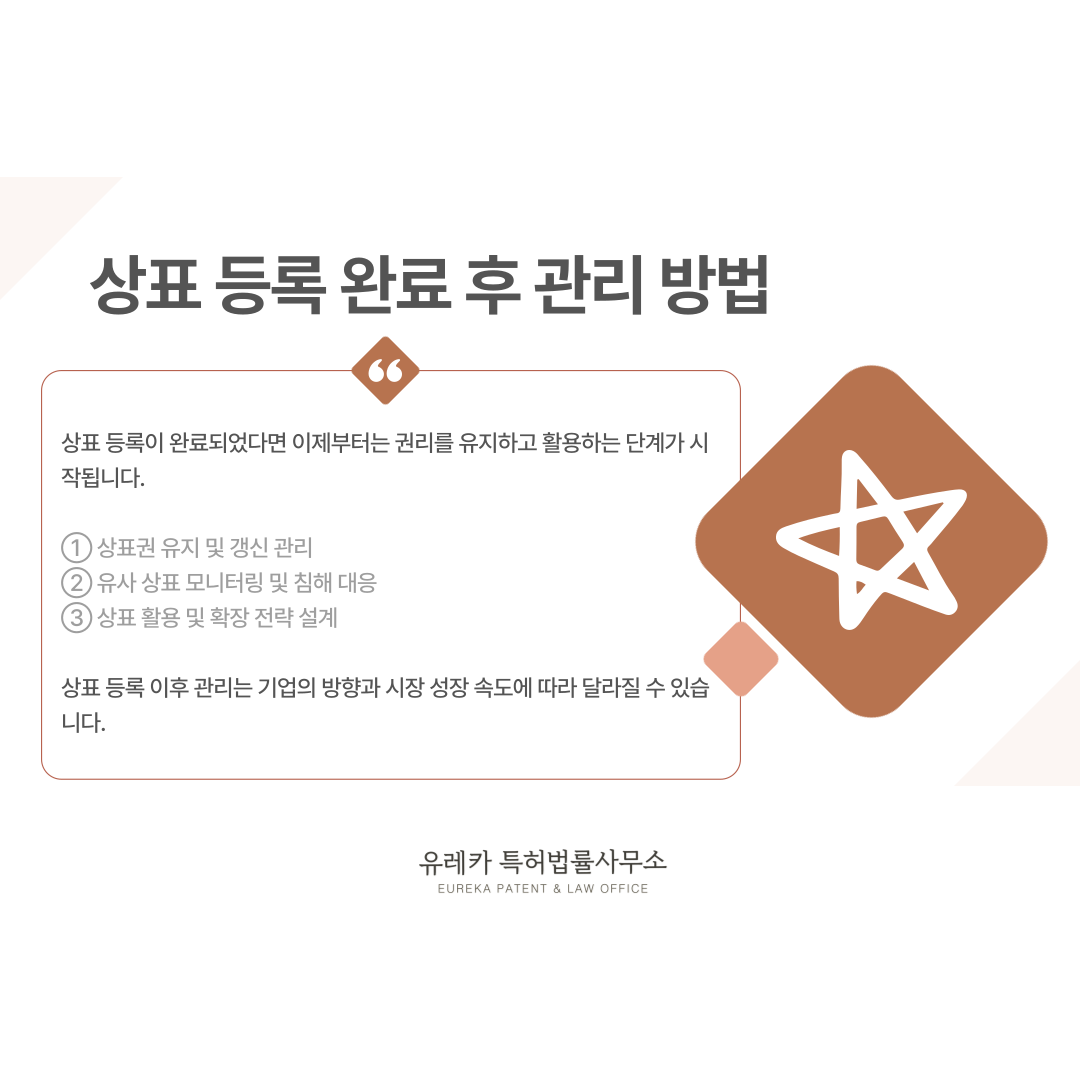 상표 등록 이후 관리는 기업의 방향과 시장 성장 속도에 따라 달라질 수 있습니다.