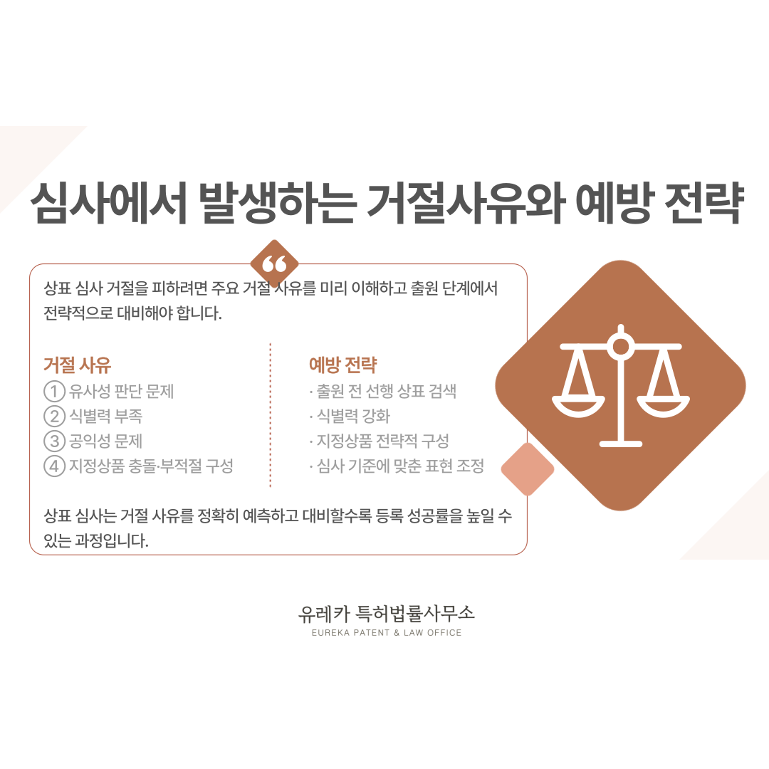 상표 심사에서는 다양한 이유로 거절이 발생할 수 있으며, 이를 미리 알고 대비하면 등록 가능성을 크게 높일 수 있습니다.