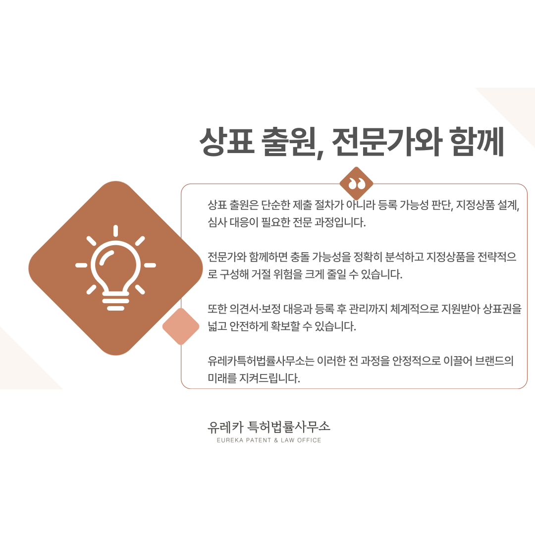 전문가와 함께하면 전체 브랜드 전략 속에서 상표권을 안정적으로 운영할 수 있으며, 온라인 플랫폼과 유통 채널에서도 더 높은 신뢰도를 확보할 수 있습니다.