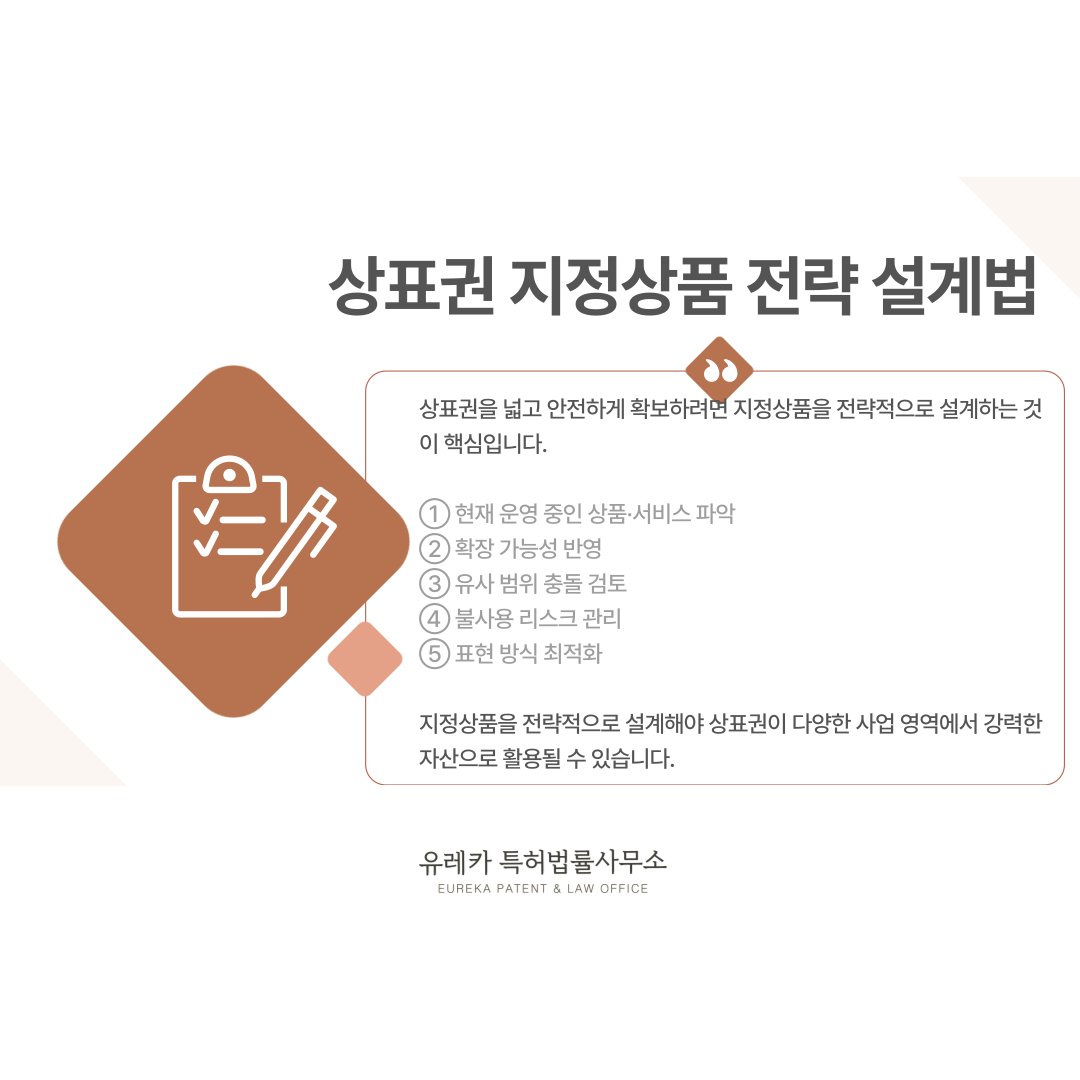 상표권을 넓고 안전하게 확보하기 위해서는 지정상품을 어떻게 설계하느냐가 가장 중요한 전략 요소입니다.