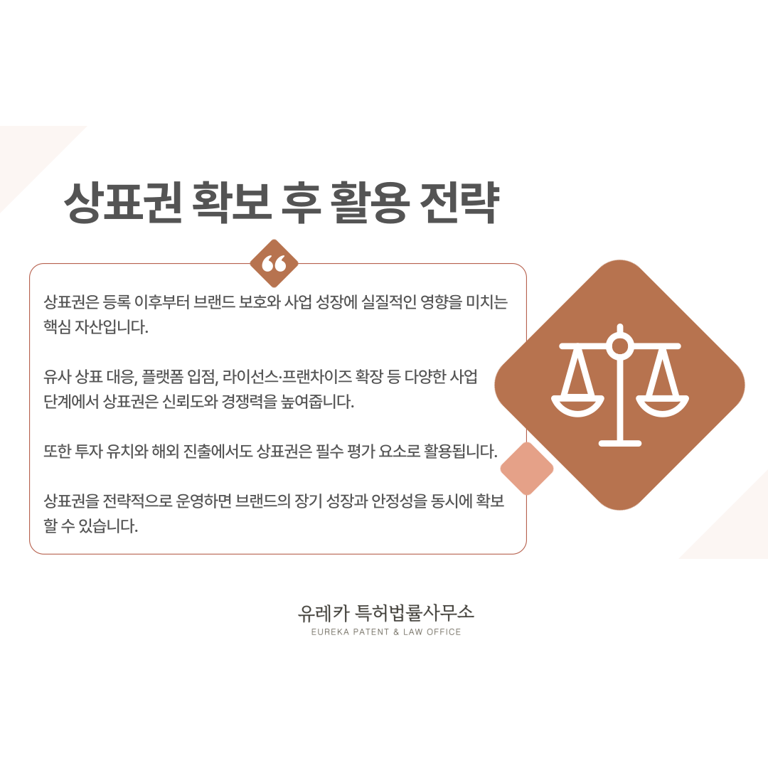 상표권 확보 후 활용 전략은 브랜드 보호부터 투자, 해외 진출, 확장 전략까지 모두 연결됩니다.