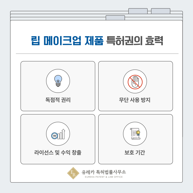 색조화장품, 립메이크업, 립컬러, 립제품 특허가 등록되면 해당 기술에 대해 독점적으로 사용할 수 있는 권리가 부여됩니다.