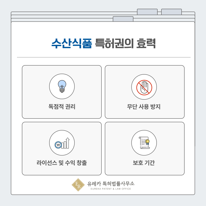 등록된 권리는 해당 수산식품 기술을 독점적으로 보호해 주는 중요한 자산이 됩니다.