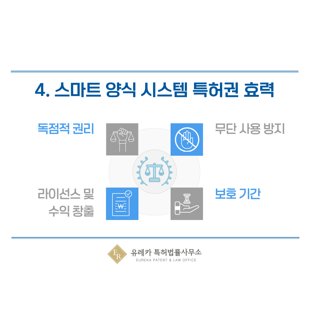 예를 들어, 스마트 가두리의 제어 알고리즘이나 RAS 시스템의 여과 구조가 등록되면, 타인은 이를 허락 없이 사용할 수 없습니다.