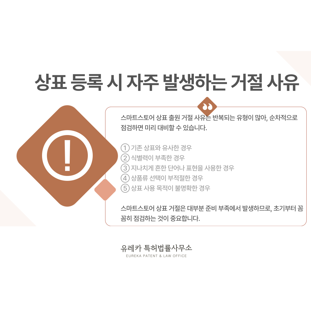 스마트스토어 상표에서 자주 발생하는 거절 사유는 대부분 출원 전 준비 부족에서 비롯됩니다.