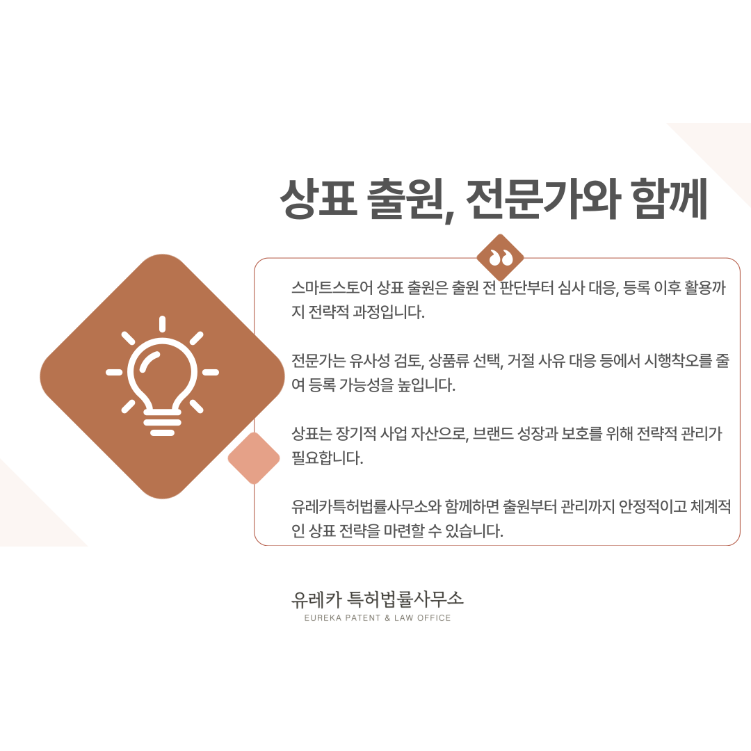 이 때문에 스마트스토어 상표 출원은 전문가와 함께 진행하는 것이 중요합니다.