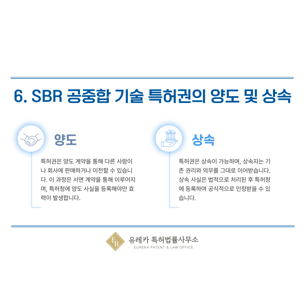 특허권은 권리자가 사망했을 때 일반 재산과 마찬가지로 상속 재산에 포함됩니다. 상속인은 SBR 공중합 기술에 대한 권리를 승계받아 권리자가 누리던 독점적 권리를 동일하게 행사할 수 있습니다. 이를 통해 상속인은 직접 해당 기술을 활용하거나, 필요하다면 제3자에게 다시 양도하거나 라이선스를 부여할 수도 있습니다. 특허권은 법적으로 보호되는 자산이기 때문에 권리가 끊기지 않고 안정적으로 다음 세대로 이어질 수 있습니다.