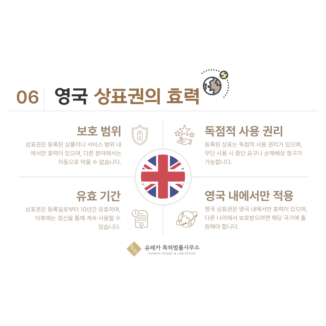 영국 상표권은 영국 내에서만 효력이 적용되며, 다른 국가에서는 자동 보호되지 않습니다.