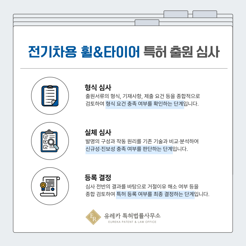 출원된 전기차 공력 휠 및 타이어 특허는 먼저 형식심사를 통해 서류 요건이 적절한지 확인됩니다.