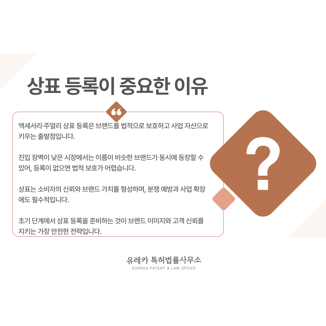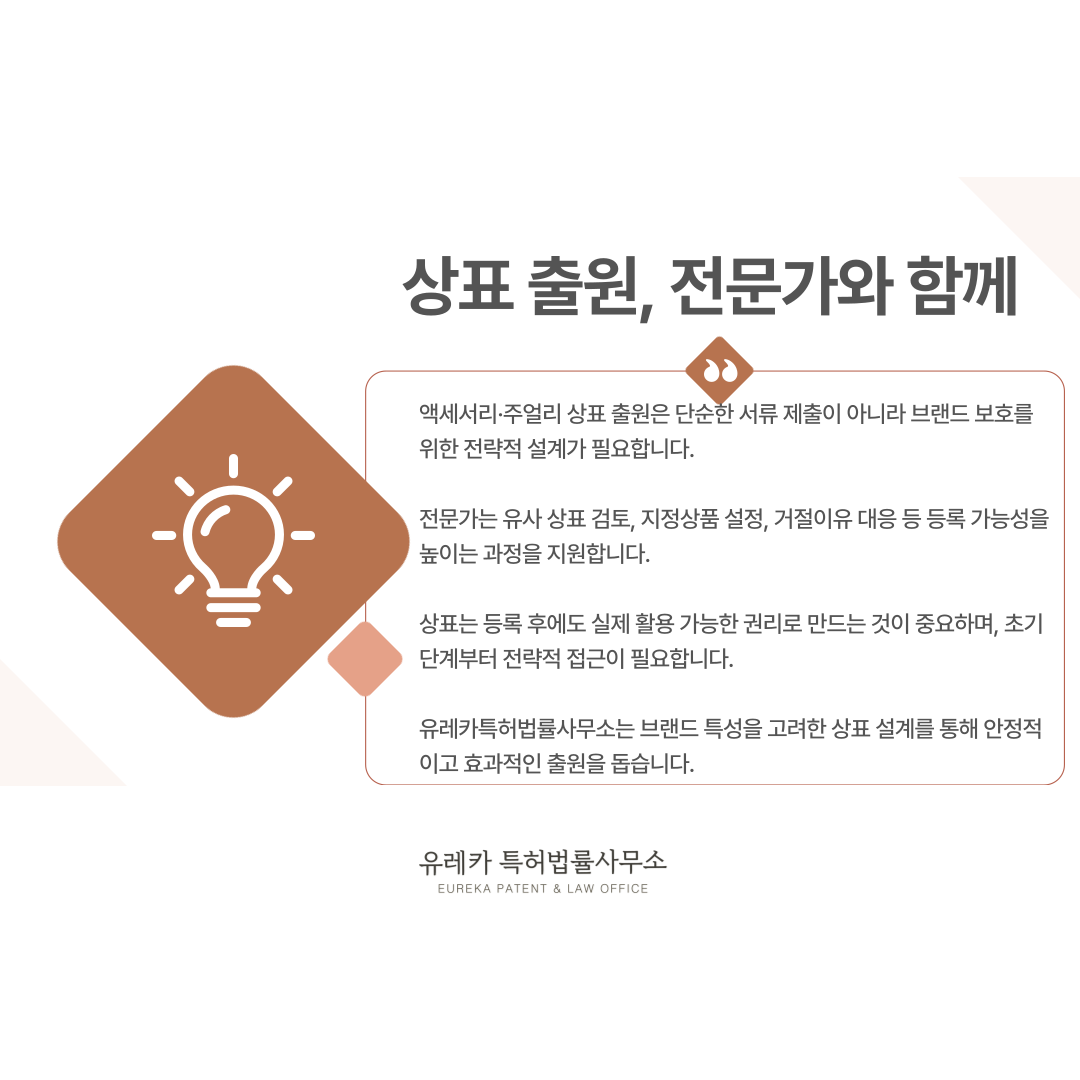 그래서 액세서리·주얼리 브랜드일수록 초기 단계에서 상표 등록을 준비하는 것이 가장 안전한 전략입니다.