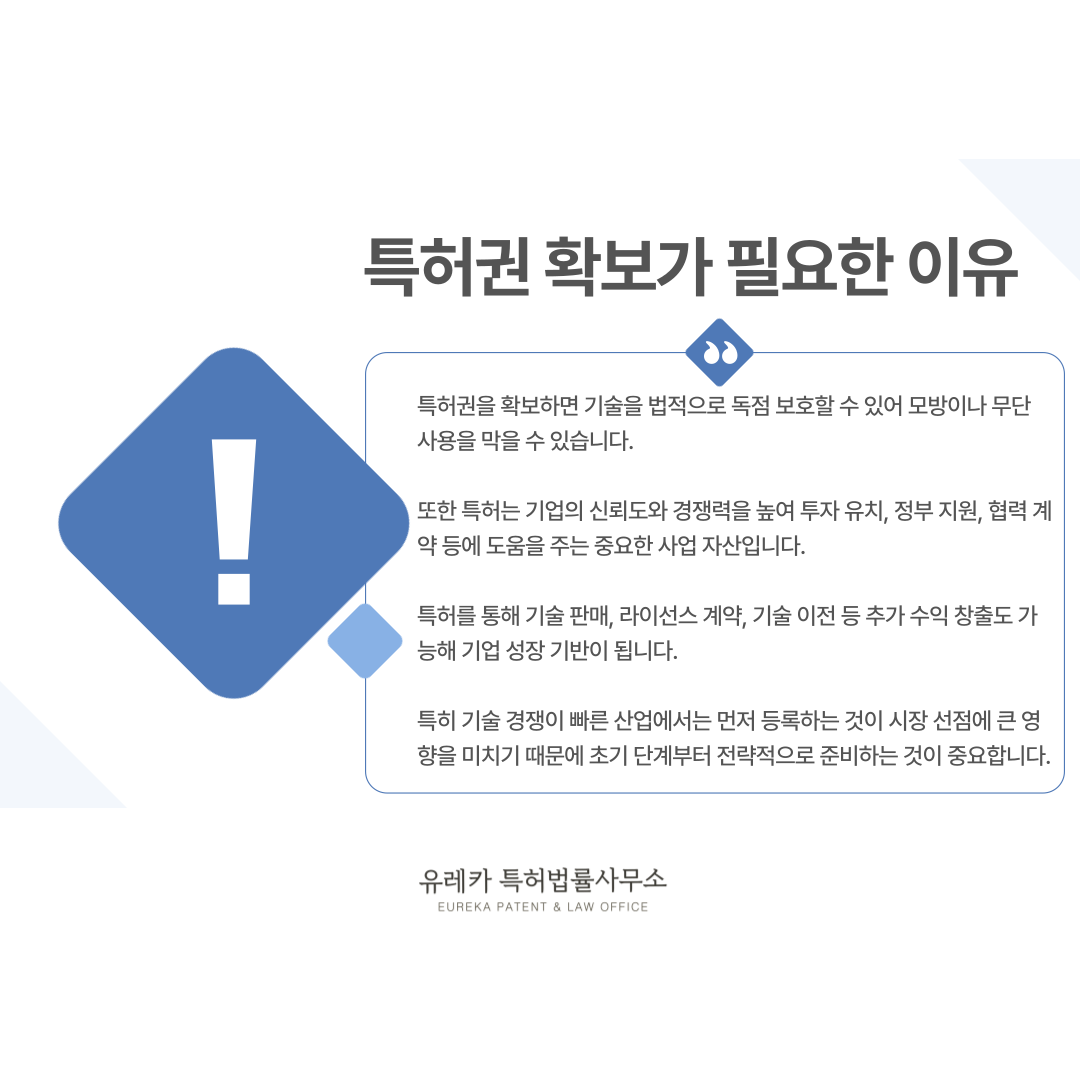 특허권 확보가 필요한 이유는 기술과 아이디어를 법적으로 독점 보호할 수 있기 때문입니다.