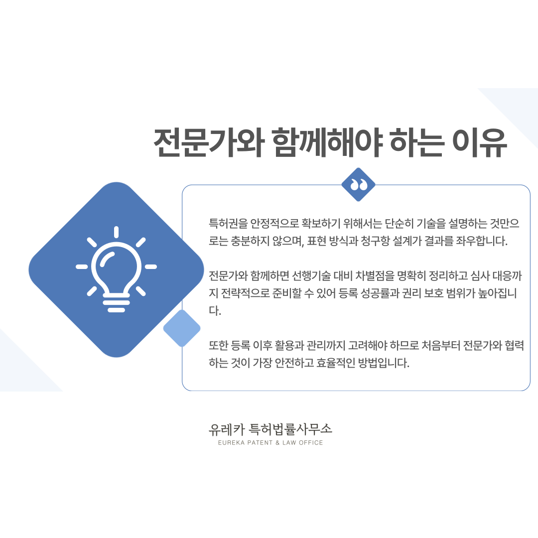 유레카특허법률사무소에서는 기술 분석, 권리 범위 설계, 심사 대응까지 전 과정에서 안정적인 특허권 확보를 도와드립니다.