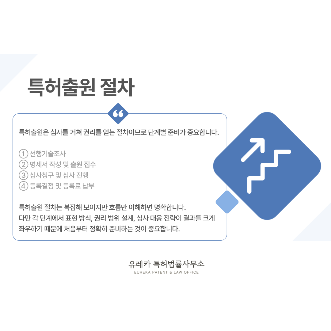 특허출원 절차는 복잡해 보이지만 흐름만 이해하면 명확합니다.