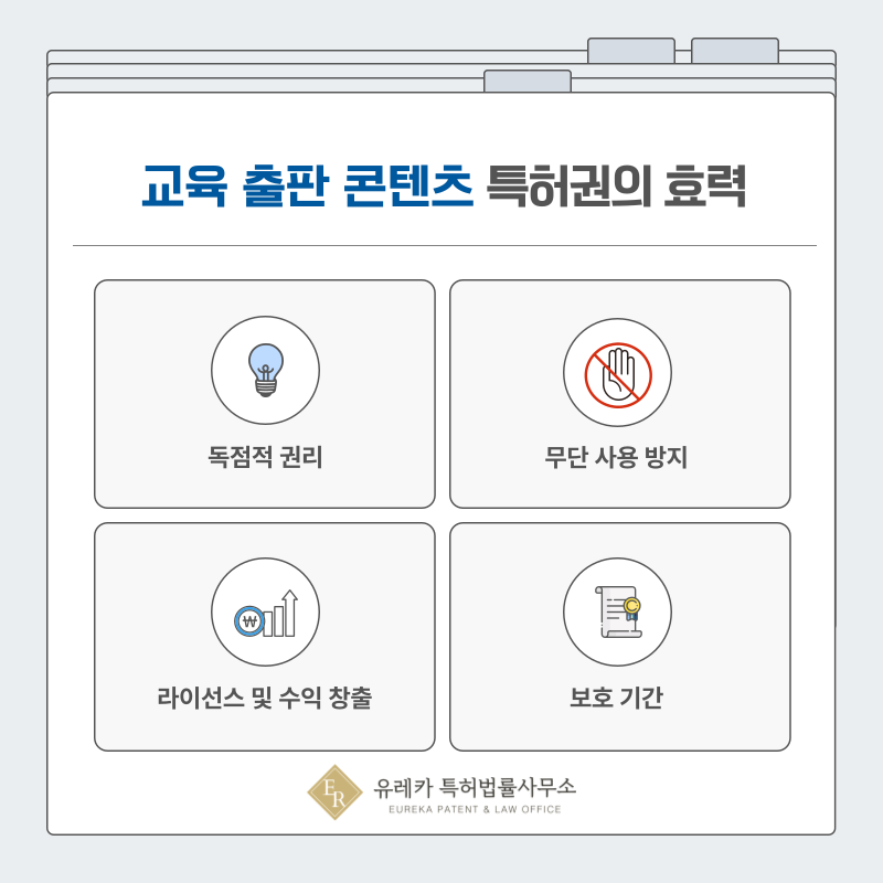 특허가 등록되면 해당 학습자료나 교육 콘텐츠 기술에 대해 독점적으로 사용할 수 있는 권리가 부여됩니다.