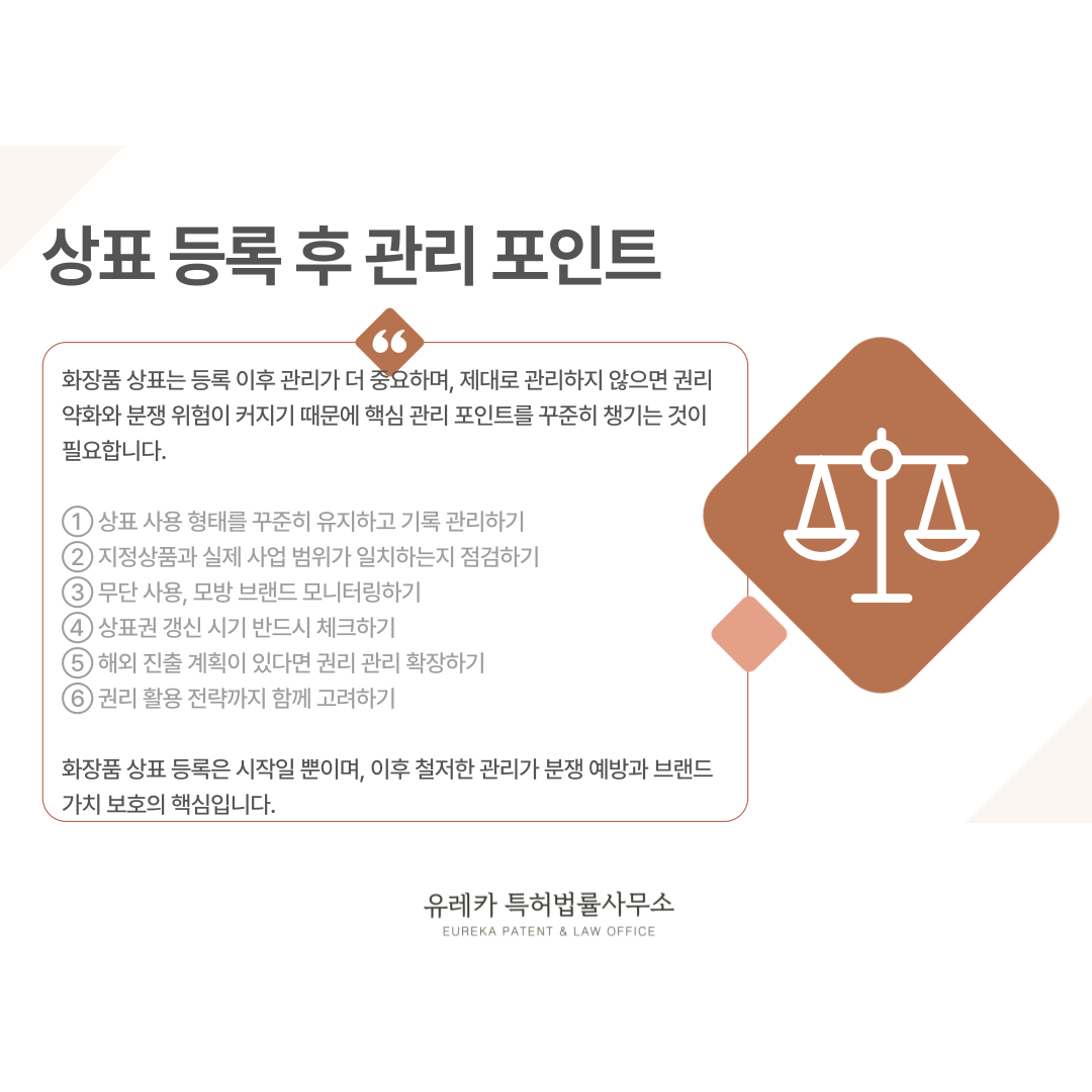 화장품 상표를 제대로 활용하고 싶다면 등록 이후 관리까지 함께 점검해 보시는 것을 추천드립니다.