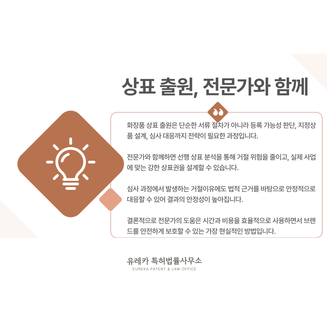 화장품 브랜드를 안전하게 보호하고 싶다면 절차를 정확히 이해하고 체계적으로 준비하시는 것이 가장 좋은 출발점입니다.