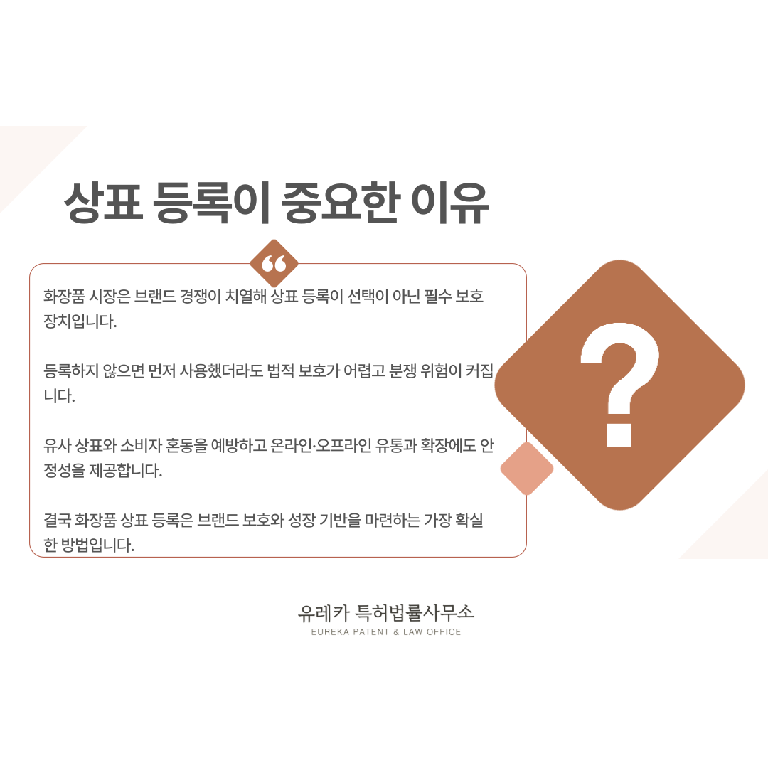 #화장품상표등록 #화장품상표출원 #브랜드보호 #화장품브랜드 #상표분쟁예방 #화장품사업 #지식재산권 #TrademarkRegistration #TrademarkApplication #상표 #상표권 #상표출원 #상표등록 #유레카특허법률사무소