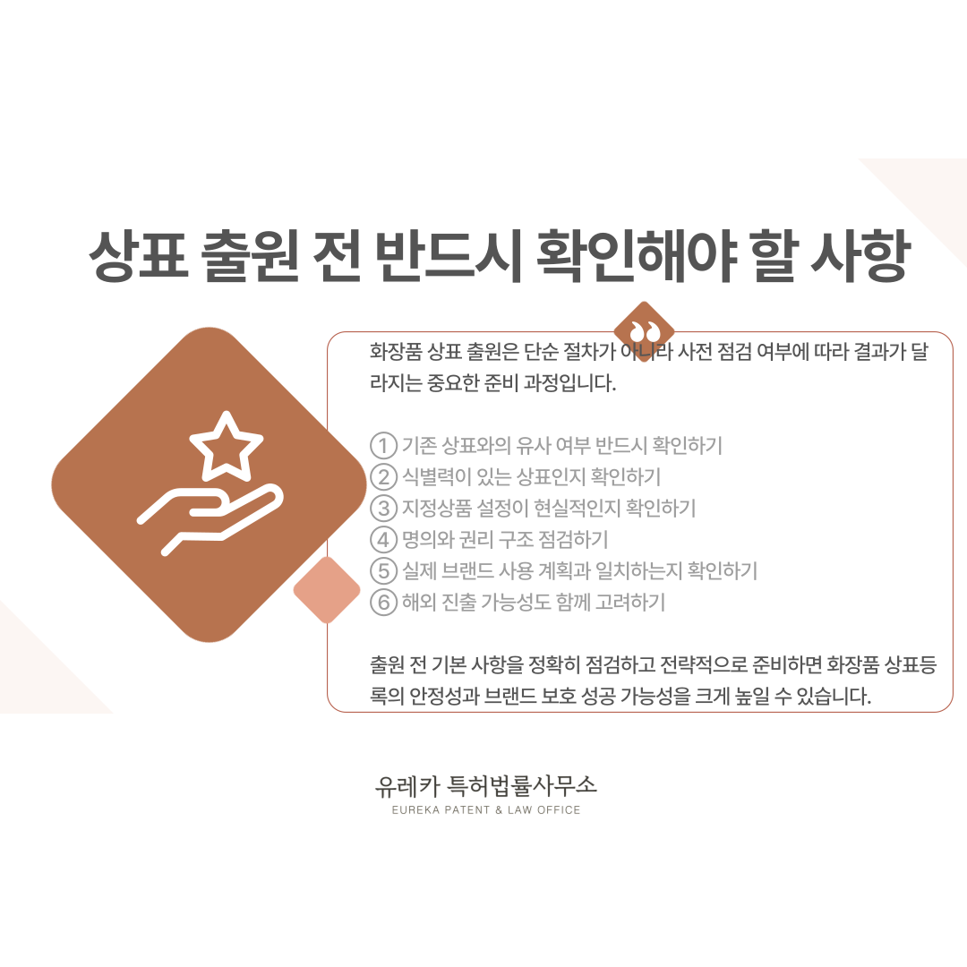 화장품 상표 출원 전 이와 같은 기본 사항만 잘 점검하셔도 거절 위험을 크게 줄이고 훨씬 안정적으로 상표등록을 준비하실 수 있습니다.